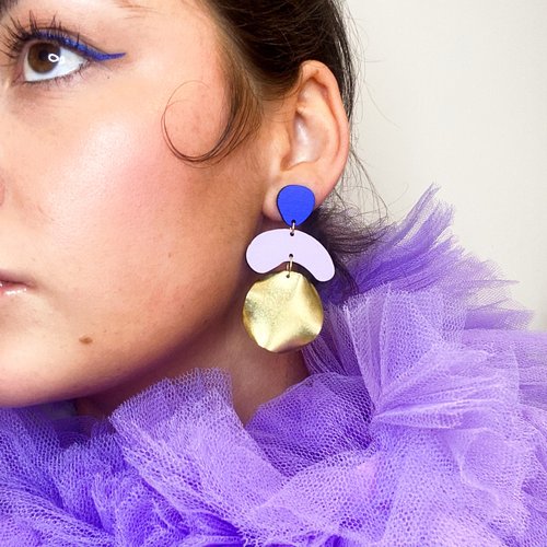 Megadrop earrings are made from hand painted laser cut birchwood ply with giant brass bevelled disc. Earrings come with stainless steel pins and gold plated backs.