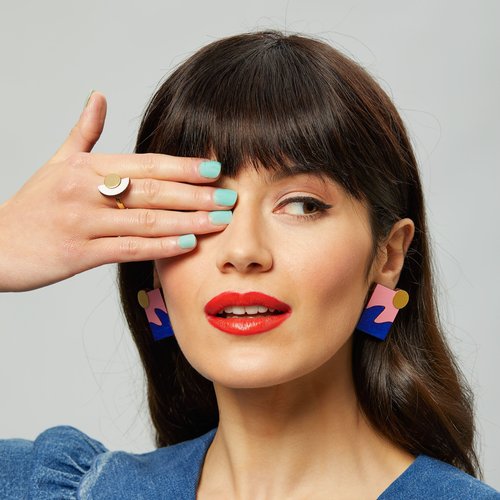New Wave earrings in hand painted laser cut birchwood ply and with a brass circle. Design is based on an ocean wave at sunset. Colours may vary slightly to photograph due to texture of wood. Earrings come with stainless steel pins and gold plated backs.