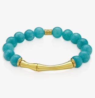 The Blue Lagoon bracelet is handcrafted with polished blue jade stones and 24 k gold plated bamboo connector.