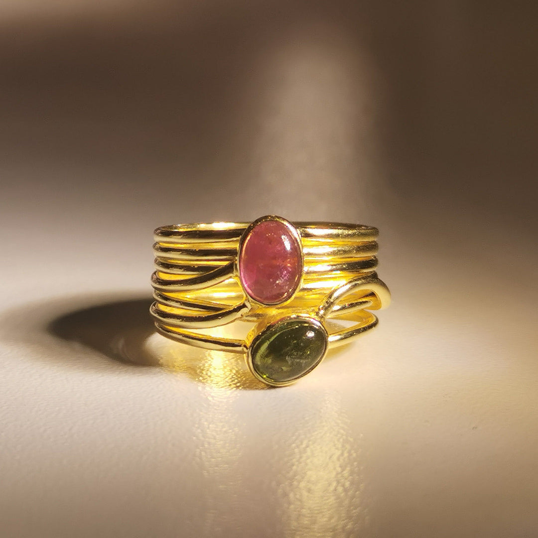 Embrace the magic of nature with our Green and Pink Tourmaline Multi-Band Gold Ring. This stunning piece features a captivating blend of colours and a handcrafted gold vermeil setting. Perfect for adding a touch of bohemian chic to any outfit, this ring is a must-have for the modern woman.