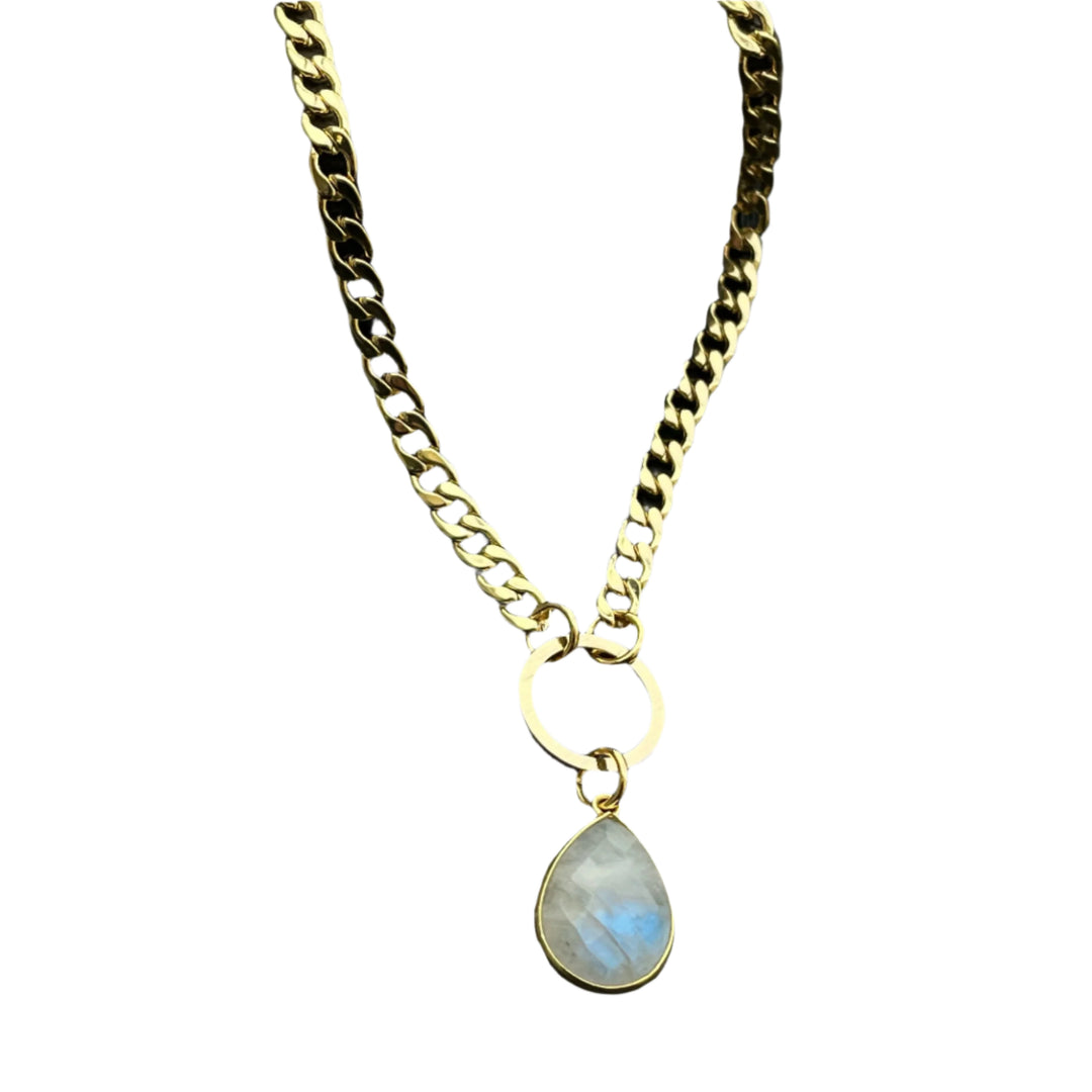 The Gaia Moonstone Necklace by Kybalion Jewellery features a gold plated curb chain with a textured circular link and an iridescent teardrop moonstone pendant, elegantly displayed on light marble.