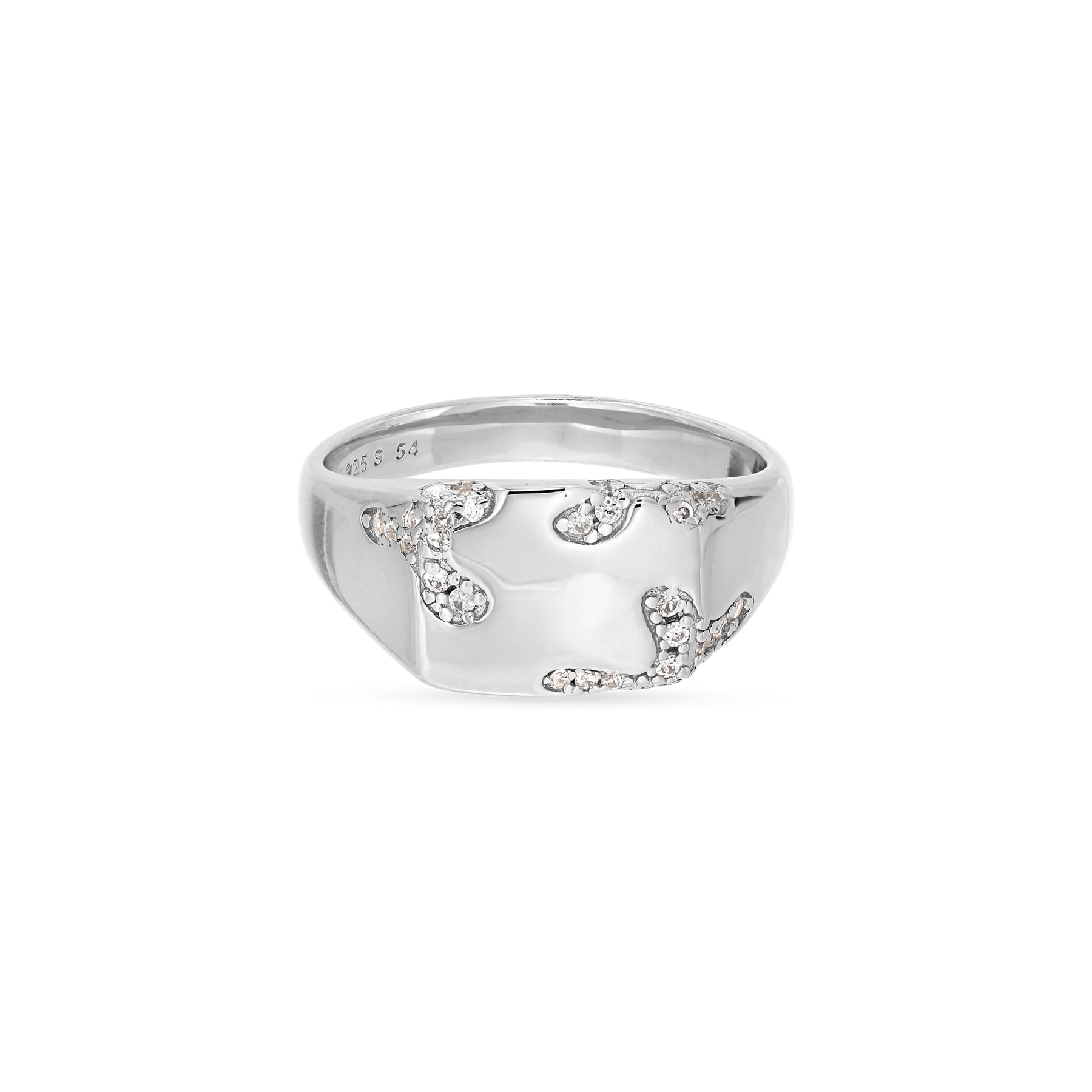 The Jane Koenig Iced Signet Ring is a 925 sterling silver ring with a rectangular top, wavy patterns, and small clear gemstones set on a polished band.