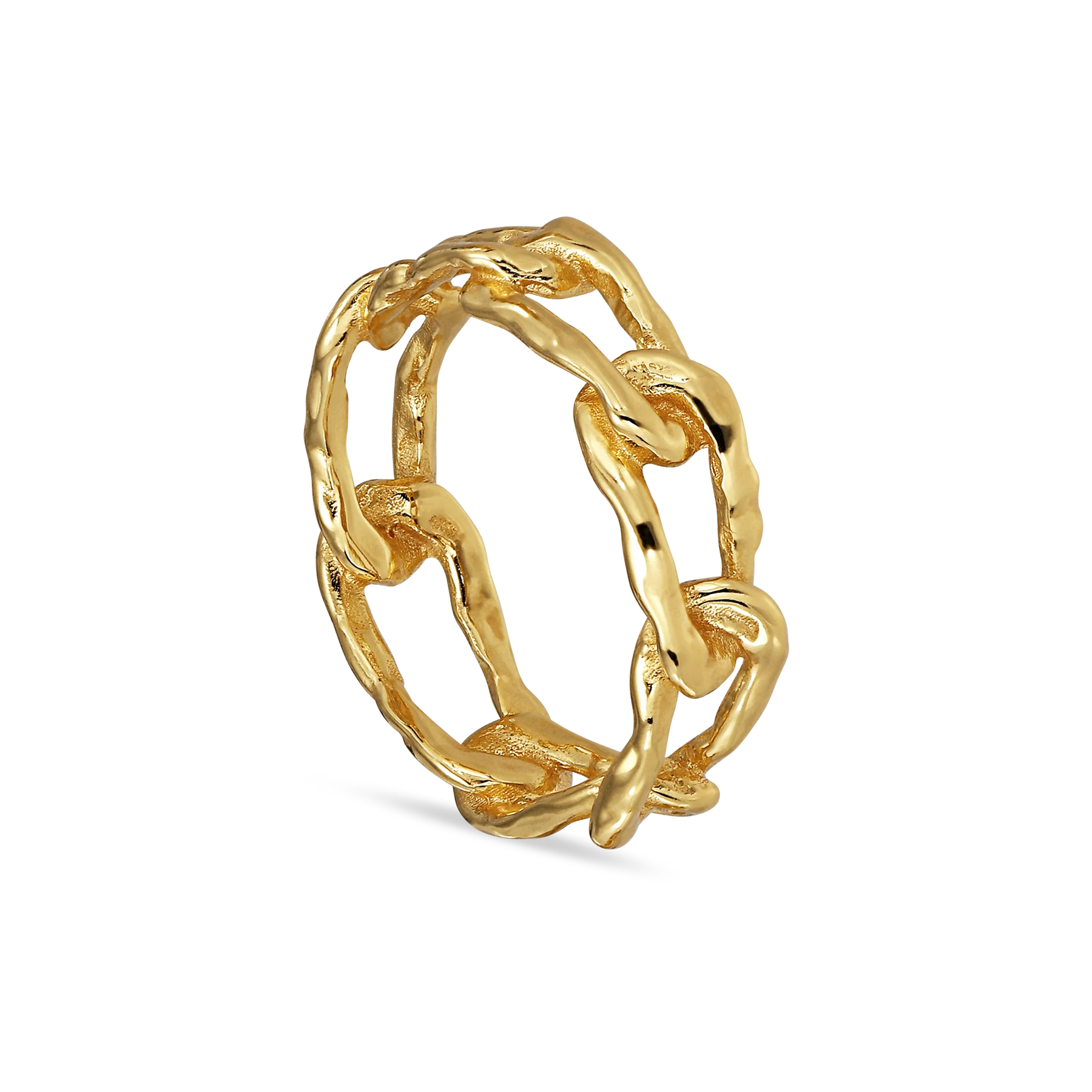 The Jane Koenig Medium Space Link Ring features a gold-plated, textured chain-link design and is displayed on a plain white background.