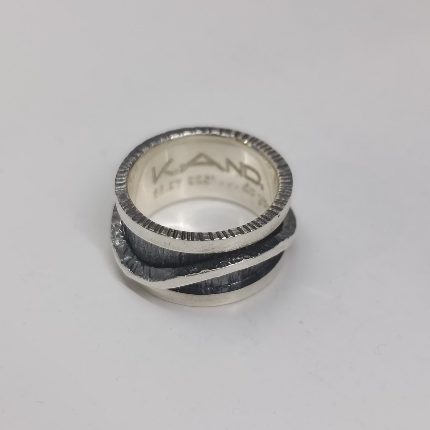 The Wave Spinner Ring by K.And features a textured silver design with a darkened oxidized center band and engraved “KAND” and “925” inside. This unique sterling silver ring is shown on a white surface.