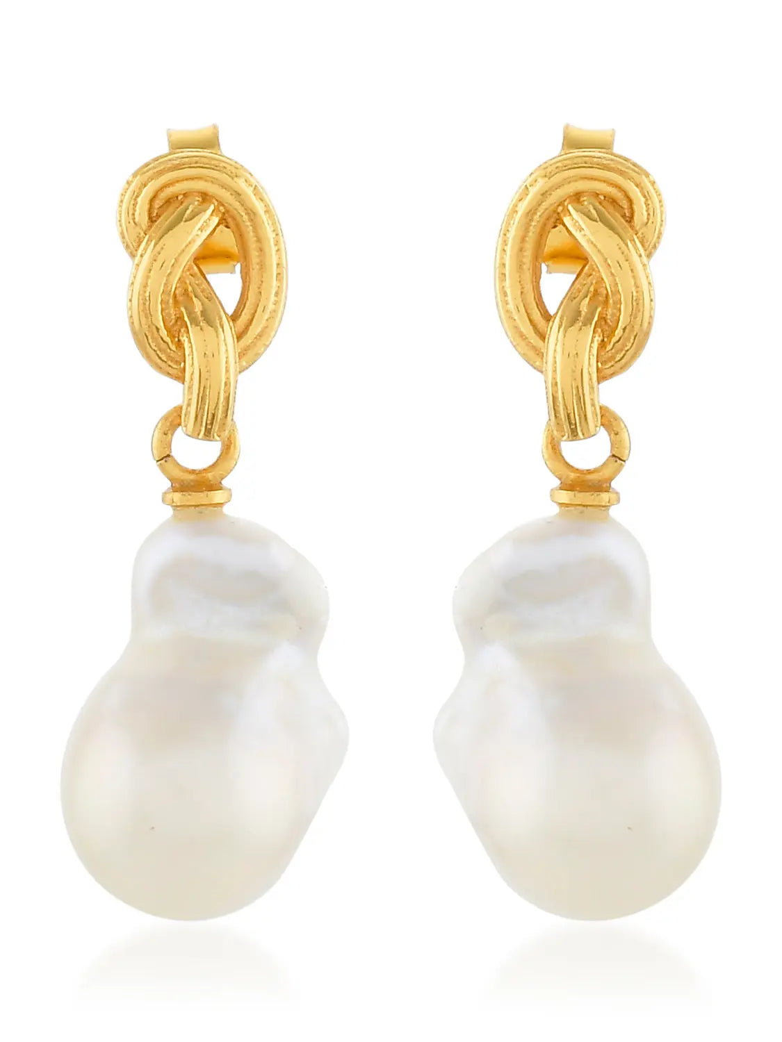 Synthea Earrings by Shyla in various colours, featuring gold knot design with dangling irregular-shaped white pearls. Elegant and hypoallergenic, they offer timeless style and comfort for sensitive ears, shown on a white background.