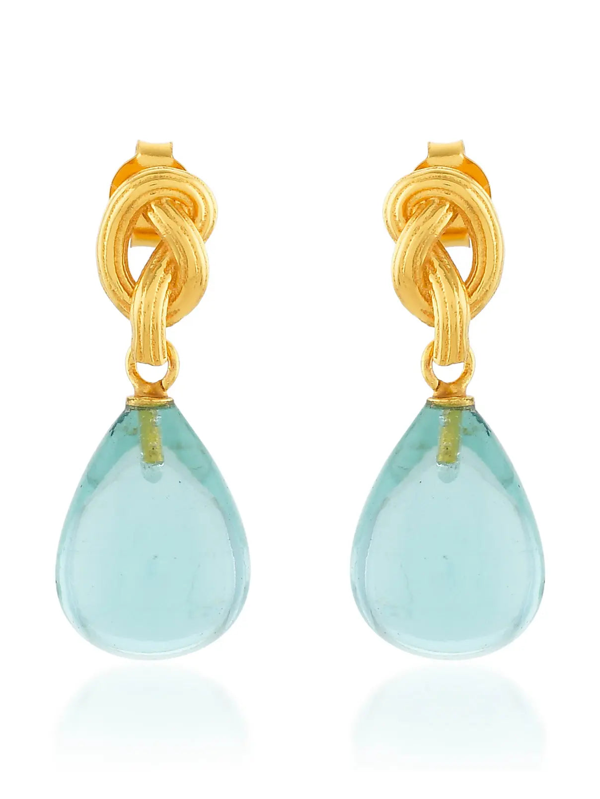 The Synthea Earrings by Shyla feature gold knots with teardrop light blue gemstones, shown on a white background. These hypoallergenic earrings offer stylish, everyday elegance and are perfect for sensitive ears. Available in various colours.