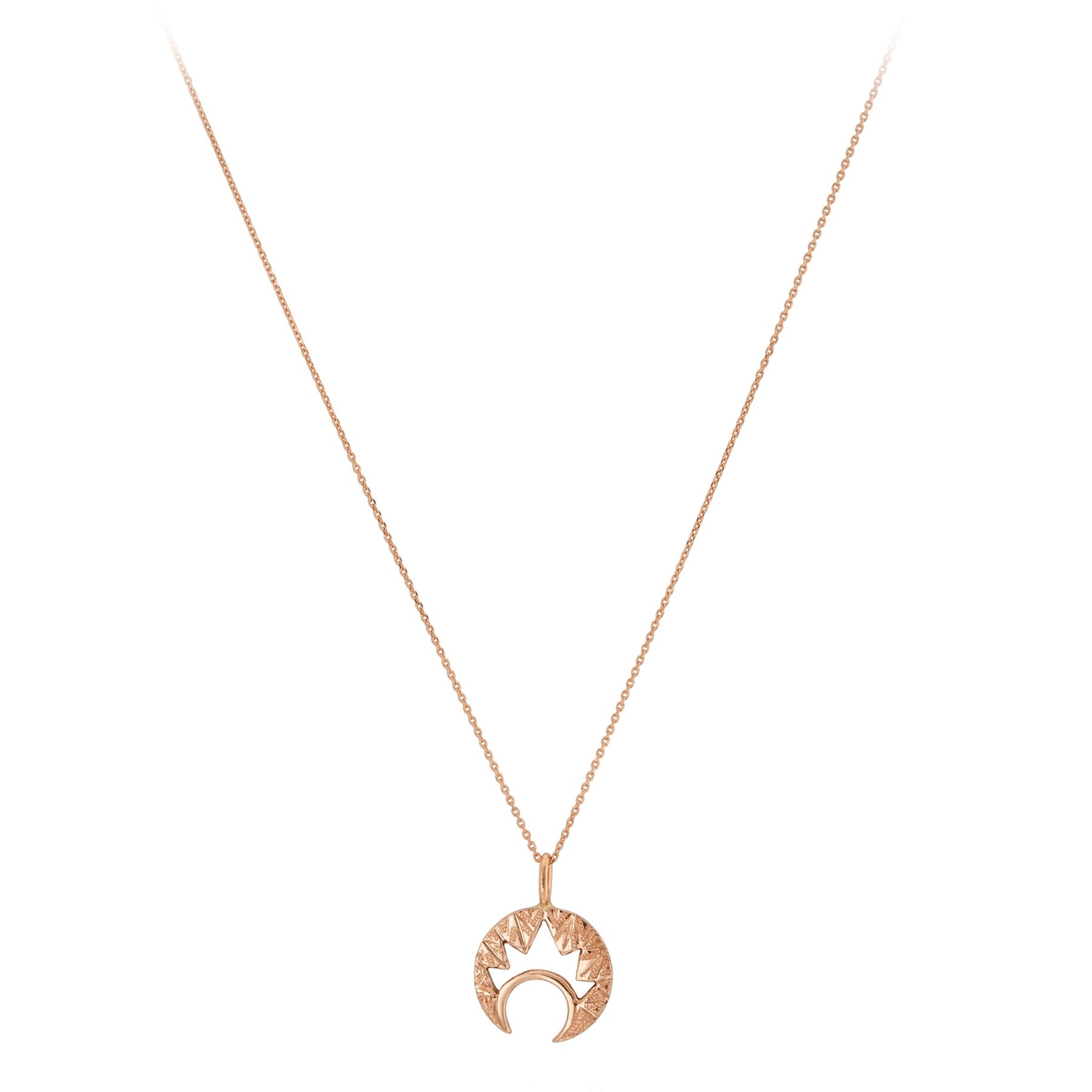 The "Moon & Moon" 9ct Gold Pendant by Cosmic Boulevard is a delicate necklace featuring a crescent moon pendant in both yellow and rose gold, adorned with a sunburst design on top. The thin, elegant chain enhances the unique and stylish pendant that combines celestial themes with intricate hand-engraved details.