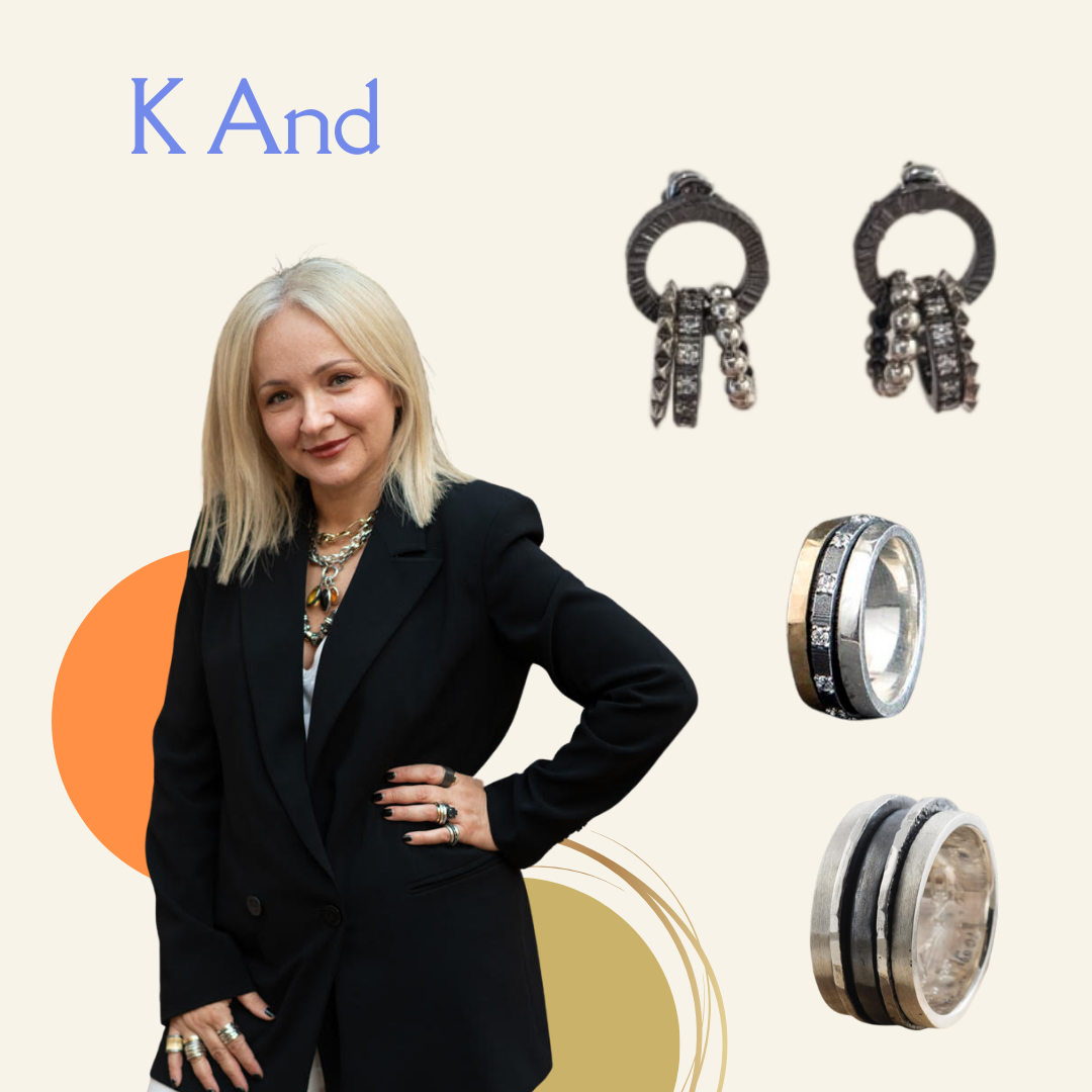 K And collections are defined by movement and minimalism. Their designs are handmade in silver and 18ct gold, with semi-precious and precious stones. They blend both modern and classic styles, in a playful and dynamic way.